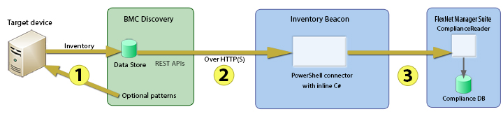 - Optionally making use of additional patterns packaged with the connector, inventory details are collected by BMC Discovery.