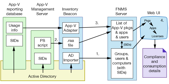 This discussion applies to use of Microsoft App-V server infrastructure, streaming applications to App-V clients on end-point devices. (Where applications are instead installed by Microsoft Endpoint Configuration Manager (previously Microsoft SCCM), use the inventory import from Microsoft Endpoint Configuration Manager instead of this adapter.)
