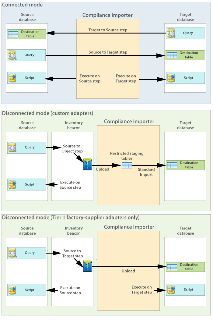 Replaces 'source to target' for use in disconnected mode with custom adapters. Instead of writing source data directly to the target database, it is written into an intermediate package format and saved on the inventory beacon. The intermediate packages are uploaded asynchronously to the cloud server, and processed (by default overnight) for import into the operations database. Restriction: Since you cannot modify the internal