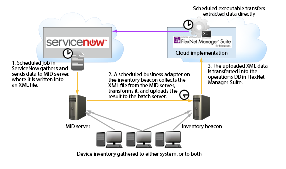 - The export of computer, application, and contract data from IT Asset Management into ServiceNow (purple arrow). For details, see Process for Exports from IT Asset Management to ServiceNow.