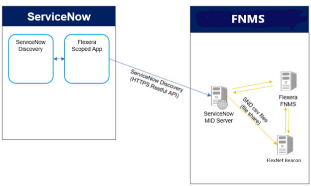 The inventory information discovered by ServiceNow first needs to be extracted and made accessible. This is done with the Flexera Integration app, available through the ServiceNow store (see installation and configuration instructions in Setting up the Integration Application). The Flexera Integration app saves the data in the .csv file format on your chosen ServiceNow MID server.